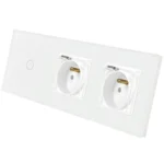 PRZEDMIOTEM AUKCJI JEST:gotowy do podłączenia włącznik światła dotykowy podwójny z dwoma gniazdami 230V, na trzy puszki montażowe, z panelem szklanym w kolorze białym matowym i podświetleniem LEDW ZESTAWIE: