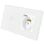 włącznik światła dotykowy podwójny z gniazdem 230V, na dwie puszki montażowe, z panelem szklanym w kolorze białym i podświetleniem LEDW ZESTAWIE: