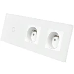 włącznik światła dotykowy podwójny z gniazdem 230V z klapką, na dwie puszki montażowe, z panelem szklanym w kolorze białym matowym i podświetleniem LEDW ZESTAWIE: